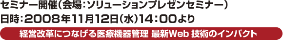 第5次診療報酬改正、h19年医療法改正と続く経営環境激変の中、生き残りをかけた大競争時代にある医療機関にとって、手つかず で残された領域である医療機器は経営パラメータとして操作しうる最高の素材です。弊社はこの領域に情報という道具によって変革をもたらすことができるとい う確信のもと、新しいサービスを提供します。今回その内容を初めて公開させていただくとともに、病院経営のプロフェッショナルにも参加いただき、その可能 性について忌憚のない意見を頂戴する予定でおります。