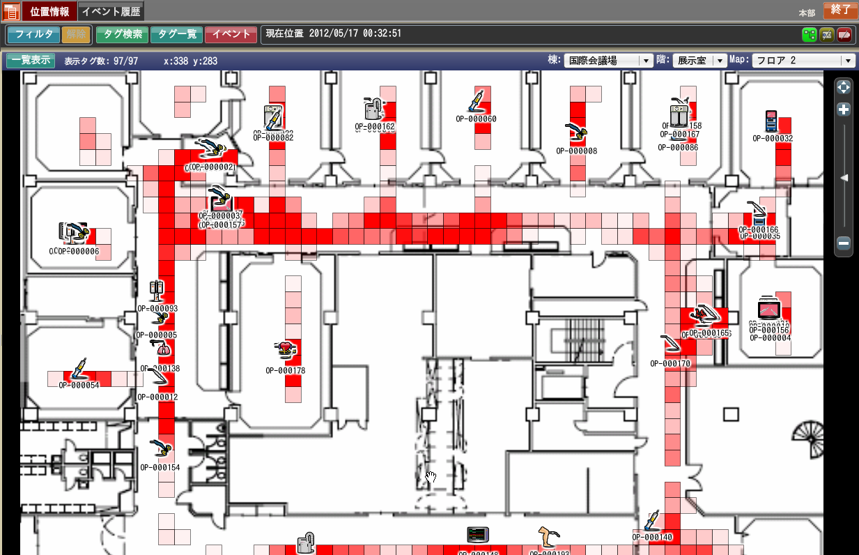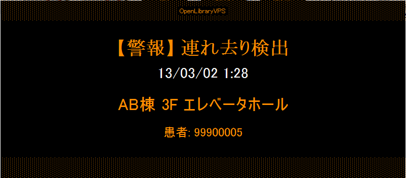 Open Library VPS (Visual Positioning System )は無線タグのリアルタイム位置・状態情報を利用して、徘徊患者の無断離院や新生児の連れ去りを監視します。患者の位置はリアルタイムで捕捉され、徘徊患者の場合は居住エリア内は自由に行動できるものの、居住エリアからの失踪を確認すると直ちにアラームを出します。新生児監視の場合は、親子のペアおよび職員と新生児のペア以外での単独検出を監視し、新生児単独で危険エリアに存在すれば即危険とみなしアラームすることができます。ひとたびアラーム状態が発生したら、継続してその患者は危険な状態として監視下におかれ位置の変化を追跡します、一階など他のフロアに出現するとその場所をアラームとして通知し、職員によるいち早い捕捉・安全確保を可能にします。