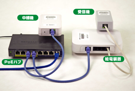 非常に省電力なので、一箇所に配置した一台のPoEハブからの電源供給で、100台以上の受信機に電力を供給可能です。