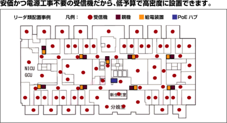 各構成装置の価格も安価に設定され、リアルタイムロケーションシステム導入にあたって障害となっていた装置費用、設置費用が大幅に節減できます。