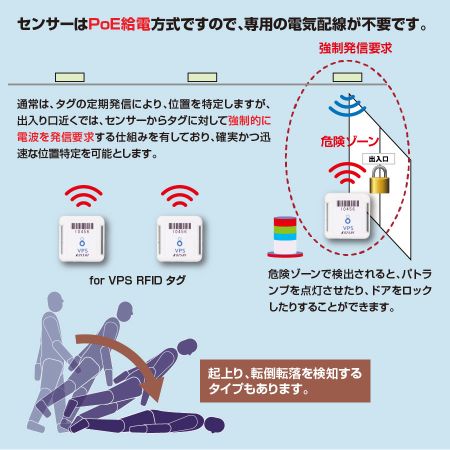 転倒監視機能を持つタグを使用すれば、どこで、だれが転倒・転落したかきめ細かく通知できます。